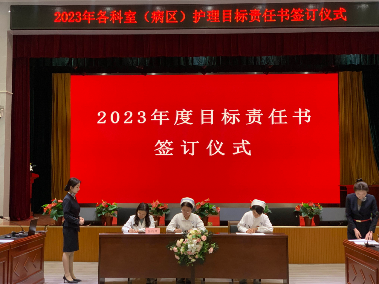 组织人事科主持了护理目标责任签订仪式,副院长何蕊芳、护理部主任张风红与29名护士长签订了2023年护理目标责任书。