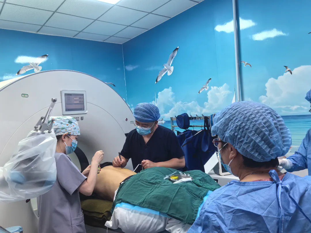 手术时首先在患者胸壁粘贴红外光学定位标记,通过CT扫描数据由机器人"智慧规划模块"进行亚毫米级三维重建,智能生成避让血管的最优穿刺路径;随后六轴高灵活度机械臂在呼吸动态监测系统辅助下,以0.5mm步进精度驱动冷冻探针穿透病灶核心,精准补偿呼吸位移偏差;最终通过-196℃氩氦刀形成边界清晰的"冰球"彻底灭活肿瘤,全程CBCT扫描实时验证消融效果。该技术实现三大突破:穿刺精度达1.85±1.67mm(较人工提升60%),手术耗时仅7.1分钟,并成功解决深部结节(距胸膜1cm)及复杂体位(脊柱侧弯半卧位)等临床难题。患者术后仅留针眼创口,4小时即下床活动,5天康复出院。