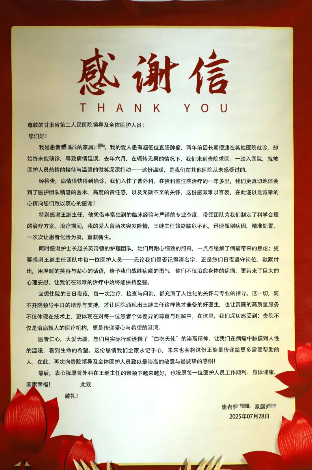 为了表达这份难以言表的感激之情,患者及家属将锦旗和感谢信送至党委书记办公室。信中,他们详细回顾了住院期间感受到的点滴温暖和医护人员的辛勤付出,字里行间充满了对普外科团队的深深谢意。