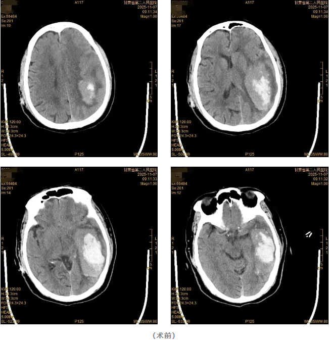 该患者因“突发意识不清伴右侧肢体无力9小时”由120急救车送至成人导航 。急诊查头颅CT显示:左侧颞顶叶脑出血,出血量约70ml。神经疾病中心团队迅速完善术前准备后,急诊为患者施行开颅血肿清除手术。手术过程顺利,术后患者意识逐渐恢复清醒,复查头颅CT确认颅内血肿已清除。