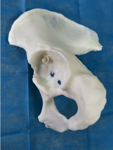 经过前期的治疗,现在左侧髋关节疼痛是影响李大妈生活质量的最大问题。通过对本次入院后髋关节CT的再次评估,张海军主任发现患者左侧髋臼骨缺损比3月前明显增多,普通假体无法完成手术,决定采用3D打印新技术评估髋臼缺损、模拟手术方案,经过3D打印模型和计算机测量评估,决定使用钽金属垫块和多孔钽杯重建髋臼。