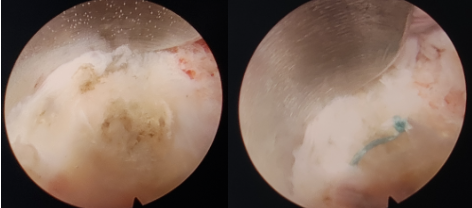(纤维环缝合前后对照;缝合前纤维环破口清晰可见,缝合后纤维环破口闭合)