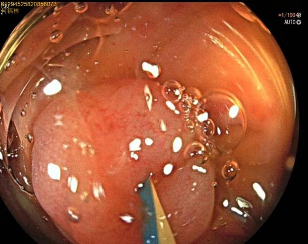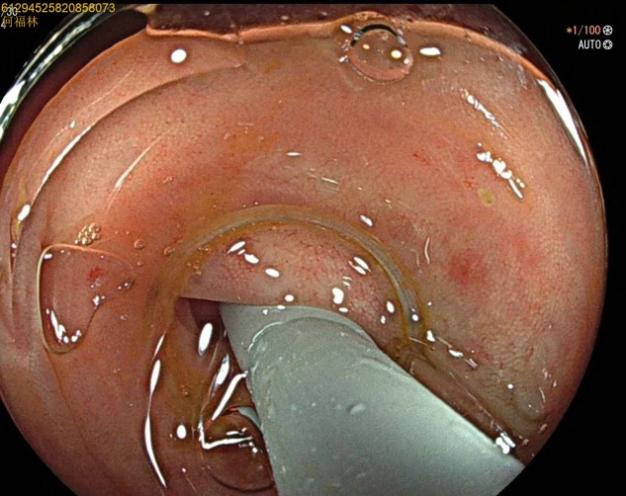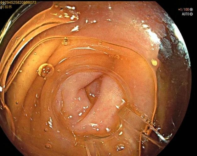 52岁,女性患者,主因“反复右下腹痛1年,再发2天”入院,既往有急性阑尾炎发作病史,入院腹部查体:右下腹麦氏点明显压痛,无肌紧张及反跳痛;完善腹部+盆腔CT示:阑尾管腔增粗并阑尾粪石形成,周围多发淋巴结显示。结合患者的病史及检查考虑慢性阑尾炎急性发作。次日,行肠镜检查,进至阑尾口,置入子镜(洞察内镜)进入阑尾,见阑尾黏膜充血、水肿,附着有白色絮状分泌物,确诊急性阑尾炎发作,进一步行内镜下逆行性阑尾治疗术,术中给予阑尾腔冲洗后植入塑料支架,术后患者腹痛即可缓解。