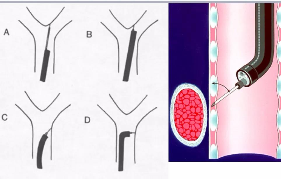 柳小平主任介绍,TBNA是经支气管镜淋巴结活检术,具体操作是气管镜经口或鼻进入气道,到达预定穿刺点后,将穿刺针由活检通道进入气道内,调整合适的角度,将气管镜前伸至目标区,然后将穿刺针穿入两气管环间的预定穿刺点的气道粘膜内,到达淋巴结。