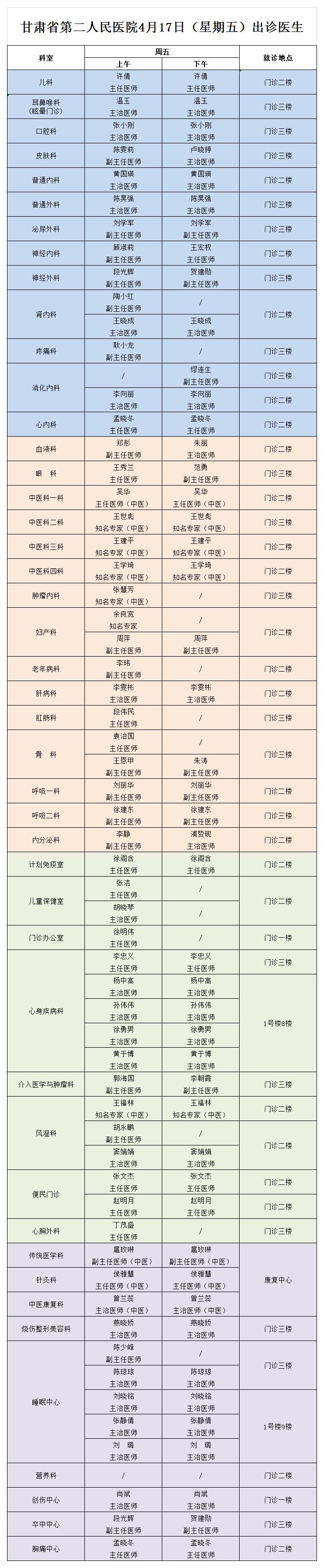 西北民族大学附属医院、成人导航 4月17日(星期五) 门诊出诊信息