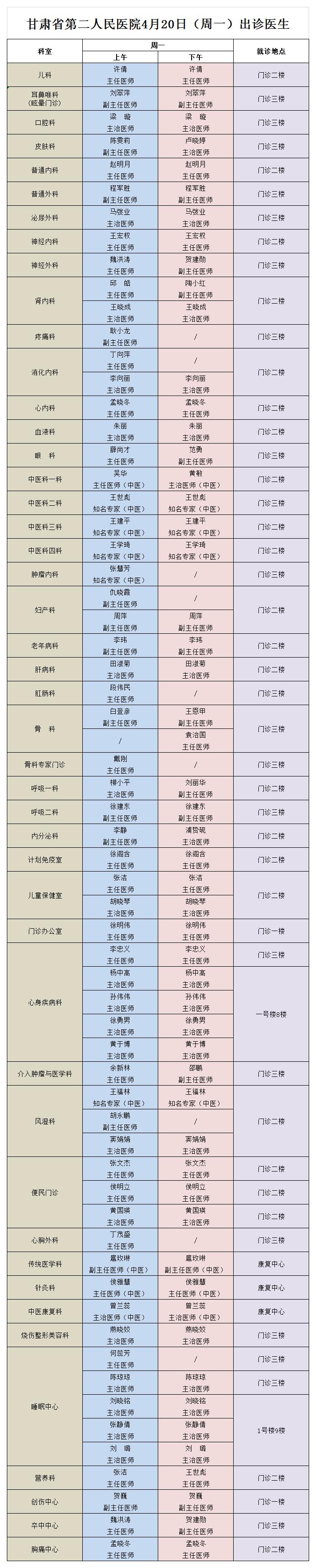 西北民族大学附属医院、成人导航 4月20日(星期一) 门诊出诊信息
