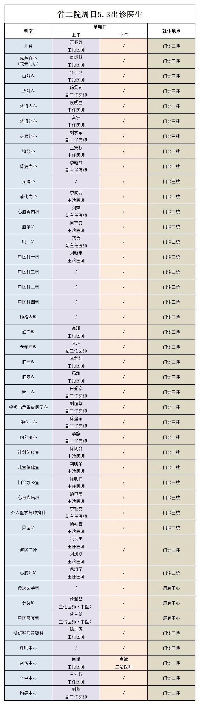 西北民族大学附属医院、成人导航 5月3日(星期天) 门诊出诊信息