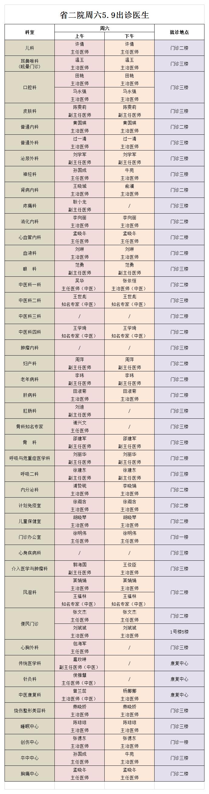 西北民族大学附属医院、成人导航 5月9日(星期六) 门诊出诊信息