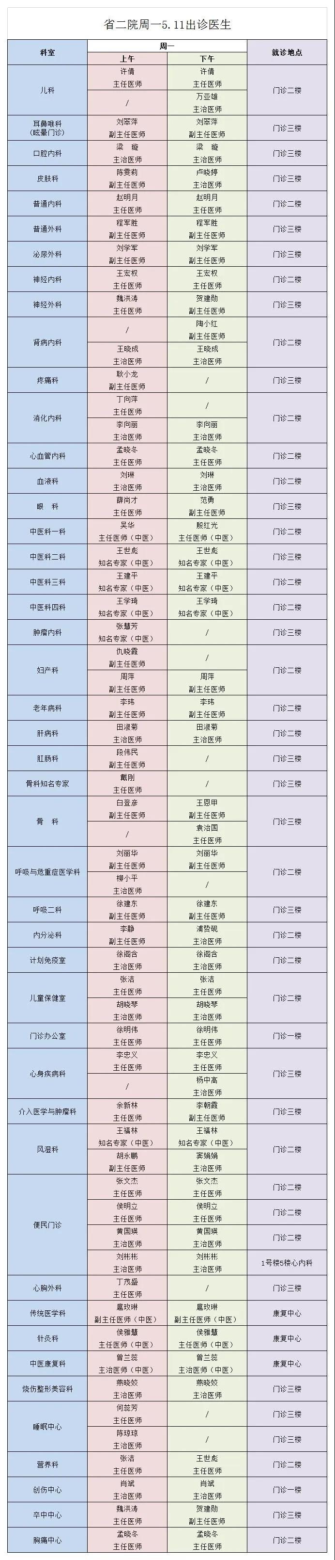 西北民族大学附属医院、成人导航 5月11日(星期一) 门诊出诊信息
