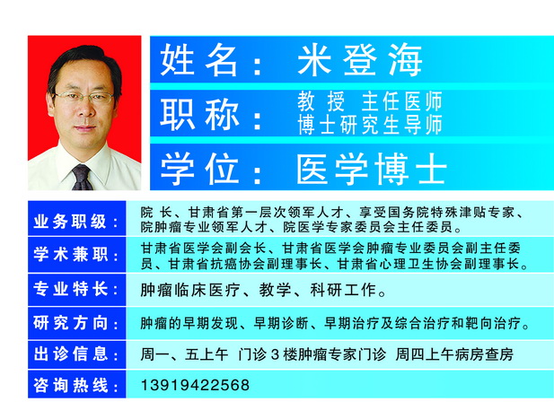 他就是米登海,肿瘤外科主任医师,医学博士,兰州大学兼职教授、博士研究生导师。甘肃省第一层次领军人才,享受国务院特殊津贴。先后任甘肃省武威肿瘤医院院长,卫生部中日友好医院院长助理(挂职),甘肃省卫生厅医政处副处长,现任成人导航