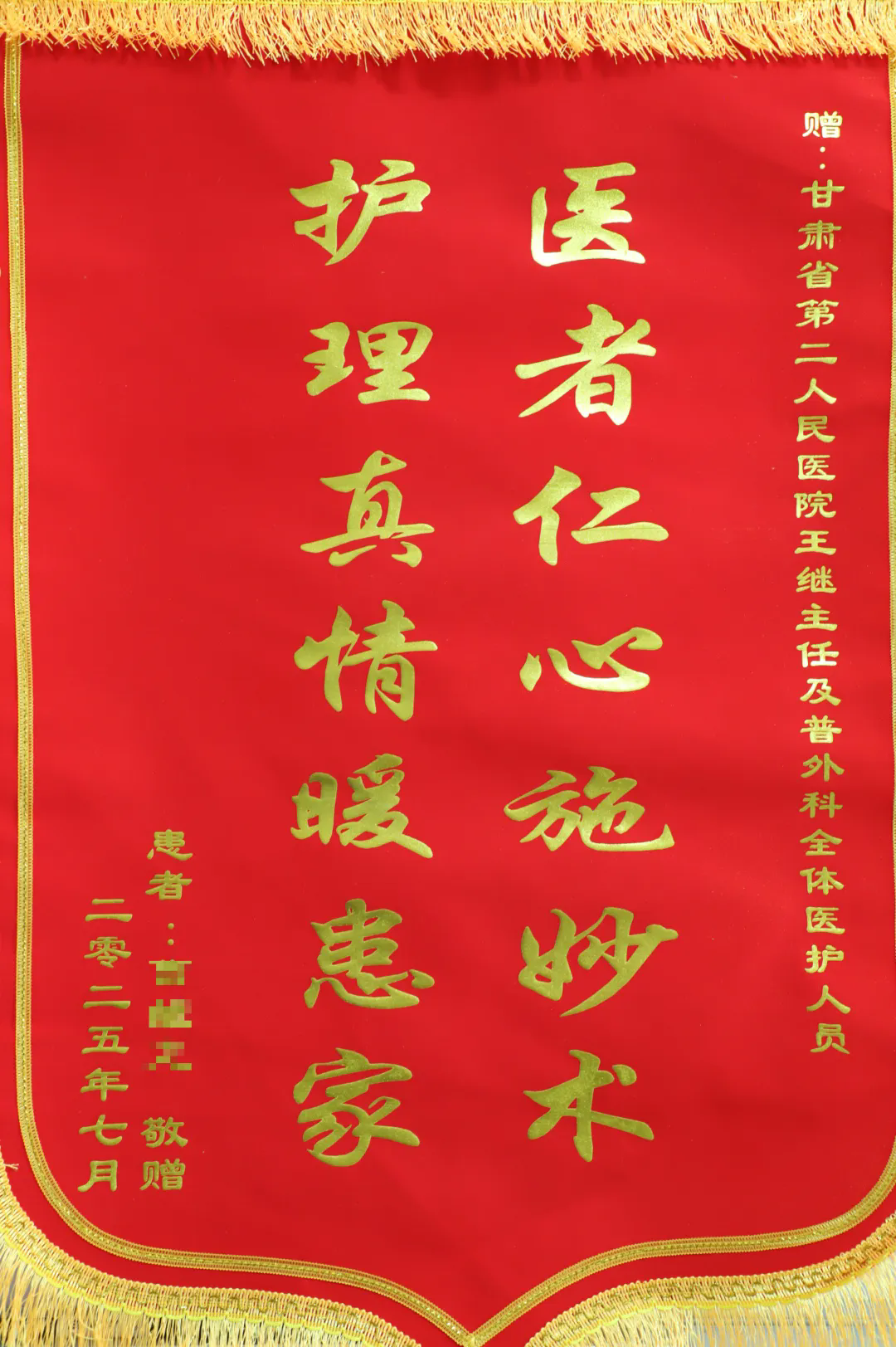 为了表达这份难以言表的感激之情,患者及家属将锦旗和感谢信送至党委书记办公室。信中,他们详细回顾了住院期间感受到的点滴温暖和医护人员的辛勤付出,字里行间充满了对普外科团队的深深谢意。