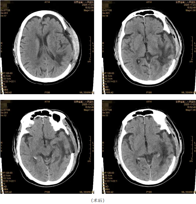 该患者因“突发意识不清伴右侧肢体无力9小时”由120急救车送至成人导航 。急诊查头颅CT显示:左侧颞顶叶脑出血,出血量约70ml。神经疾病中心团队迅速完善术前准备后,急诊为患者施行开颅血肿清除手术。手术过程顺利,术后患者意识逐渐恢复清醒,复查头颅CT确认颅内血肿已清除。