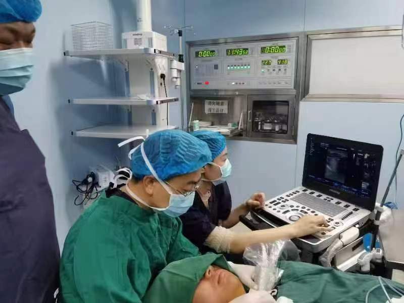 患者高某,2年前体检发现甲状腺肿物,入院后普外科副主任医师程军胜立即安排相关检查,在完善检查后彩超提示双侧甲状腺多发结节,病检结果显示甲状腺良性肿瘤,经科主任王继会诊后,与科室人员综合评估患者病情,为其制定个体化诊疗方案,行甲状腺结节射频消融术。在彩超室、麻醉科的配合下,普外科团队顺利开展甲状腺结节射频消融术,这一微创不开刀、不留痕,手术过程很短,仅仅用了10min,手术区域也无明显出血,患者无任何不适。术后患者恢复良好,第2天出院,手术区域仅剩针尖大小的小疤痕。