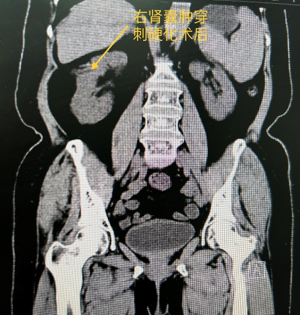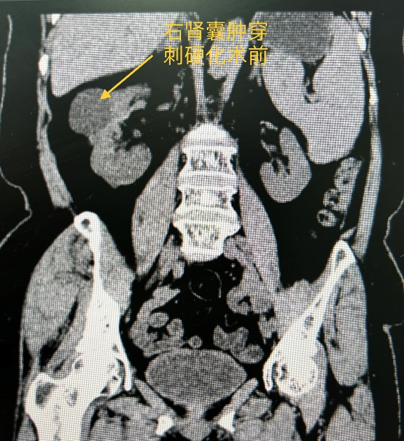 72岁的敏阿姨被腰痛症状困扰了5年,近日就诊于成人导航 肾病内科门诊,彩超提示“双肾囊性占位性病变,多考虑囊肿(右肾中极较大的54mm*45mm)”,泌尿系CT提示“双肾多发低密度病灶,考虑囊肿(右肾较大者48mm*36mm*46mm)”。经与患方沟通病情,决定行超声引导下肾囊肿穿刺硬化治疗术。