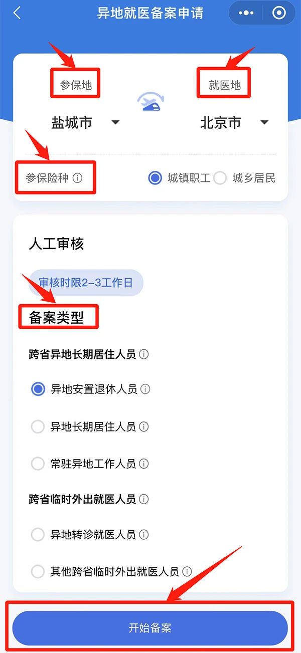 进入异地就医备案申请页面,参保地为系统默认,参保人可以根据实际情况进行调整,同时做好就医地、参保险种、备案类型的选择。